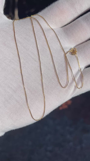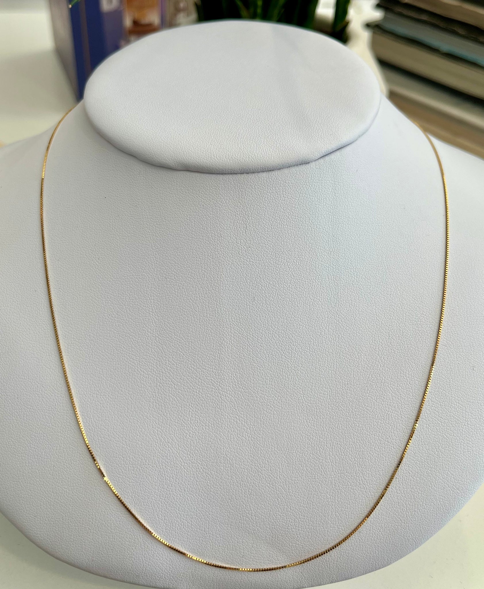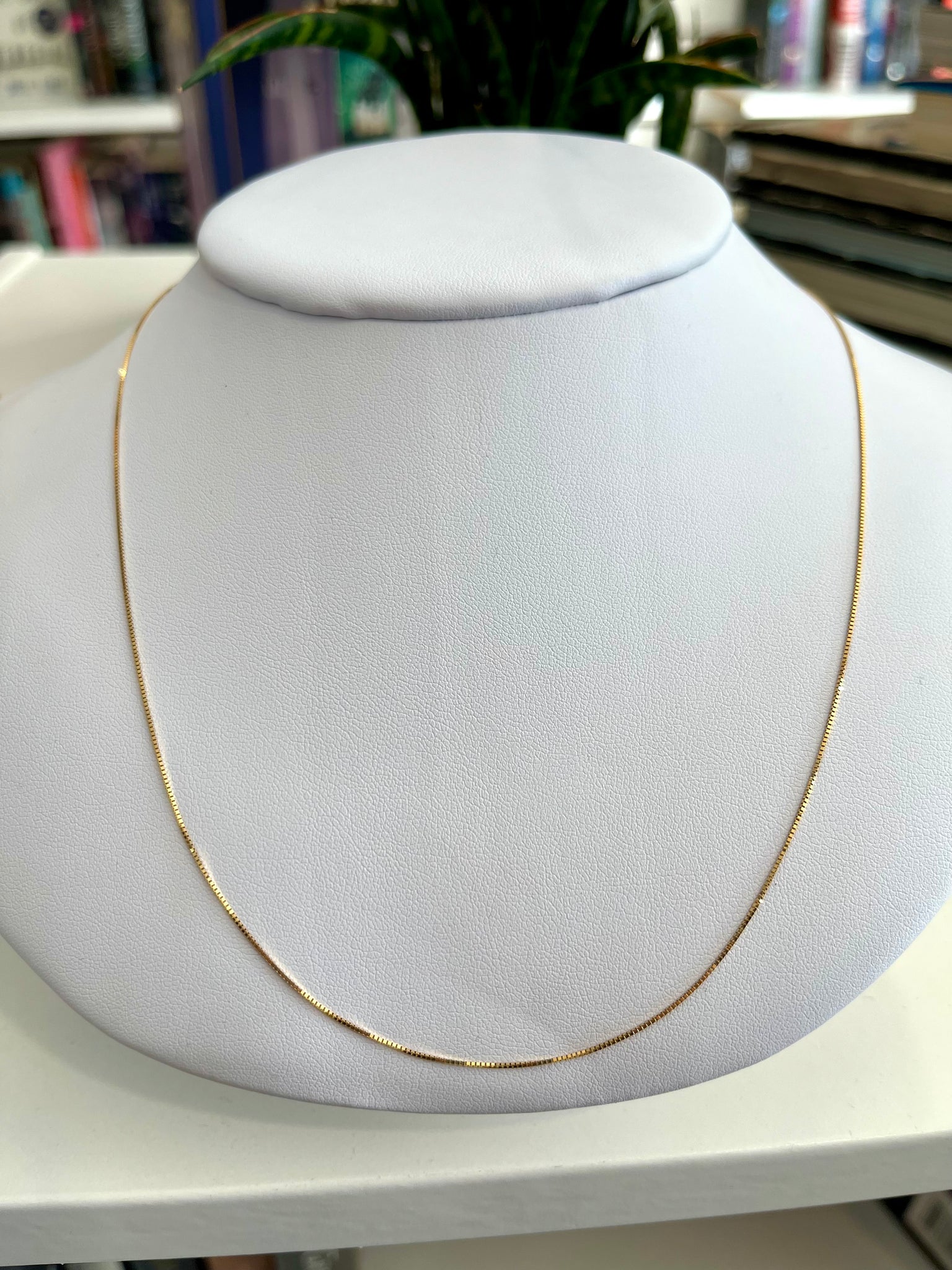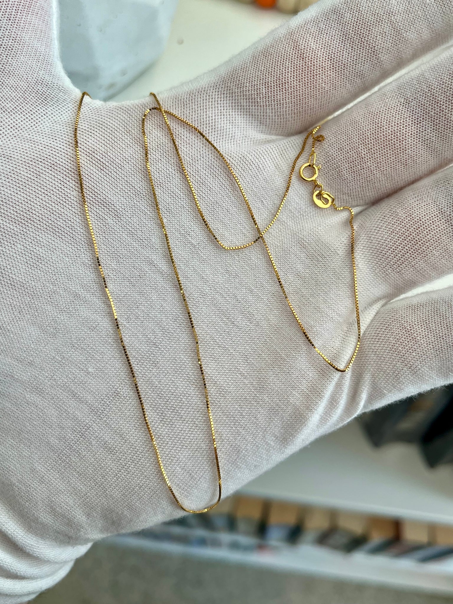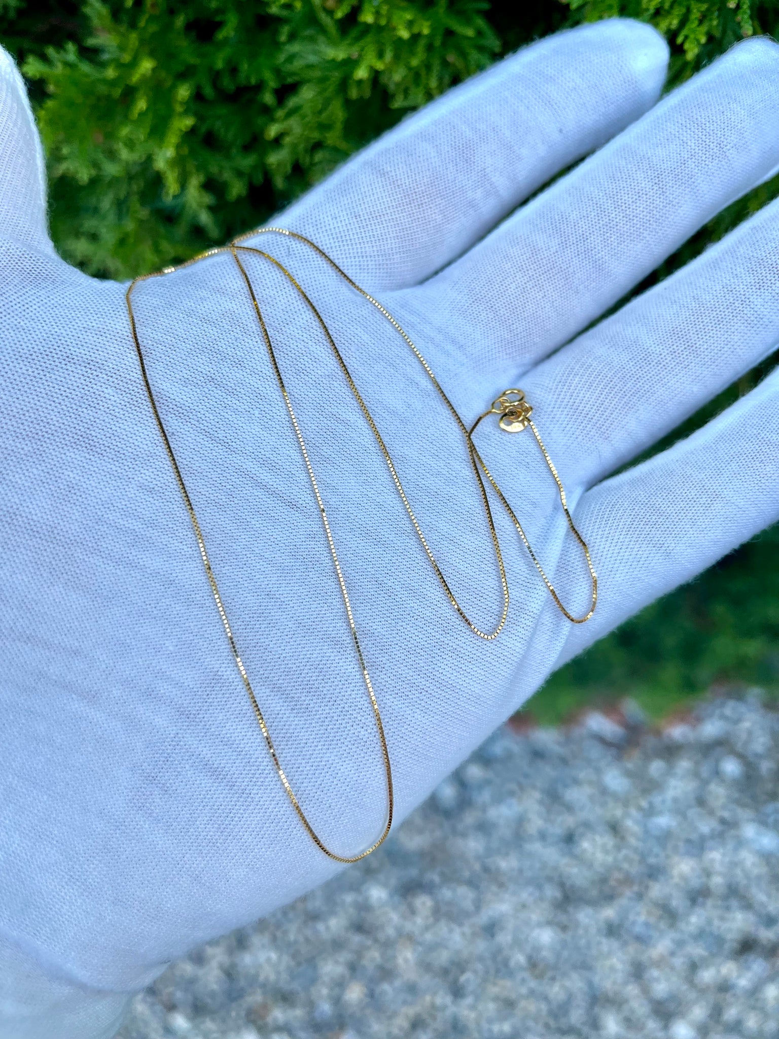 This 14K box link chain is expertly crafted in Italy and designed to enhance your favourite pendant. With its dainty yet durable construction, it effortlessly elevates your everyday look. Trust in its quality and sophistication to complement any outfit with timeless elegance.