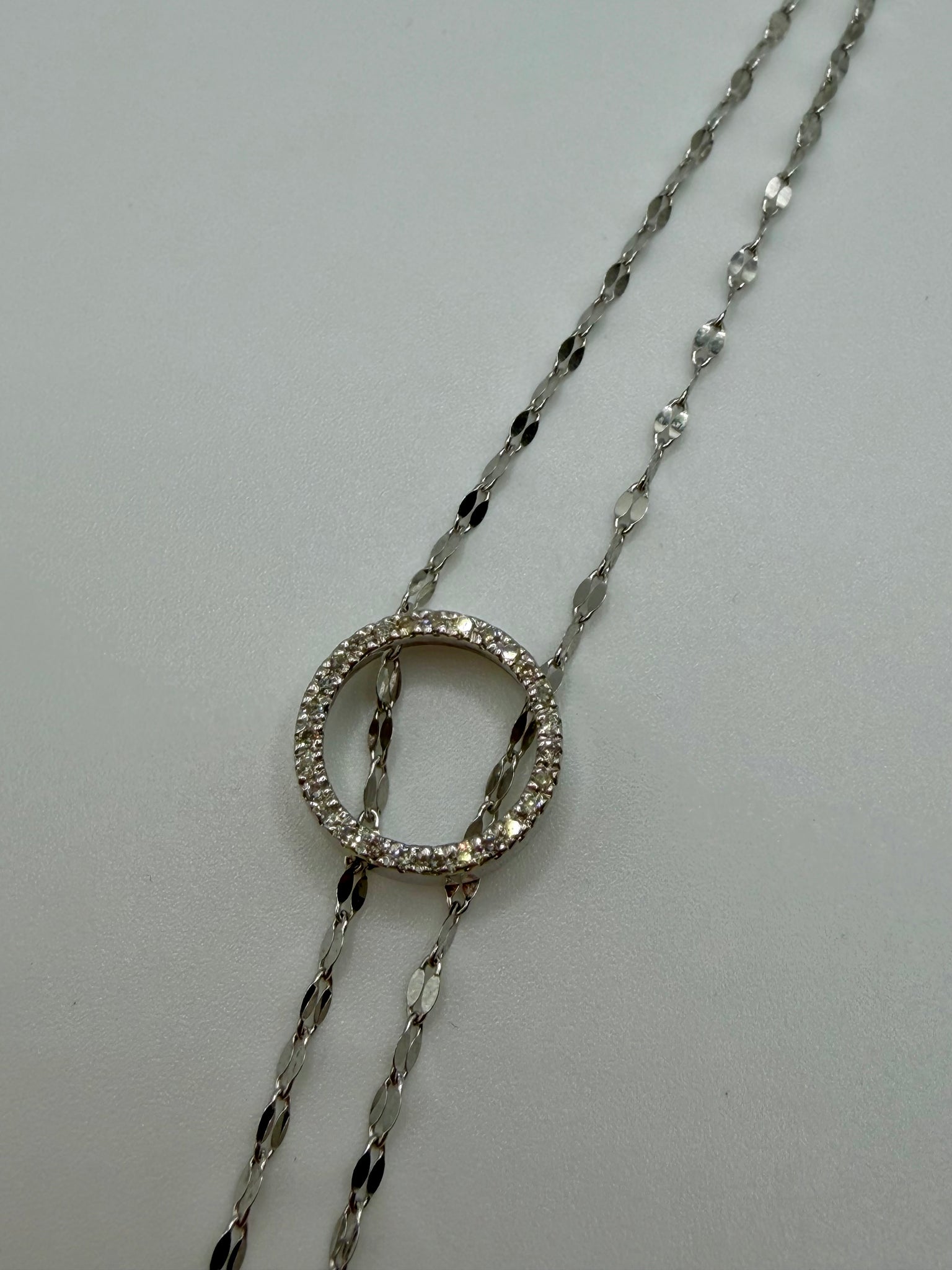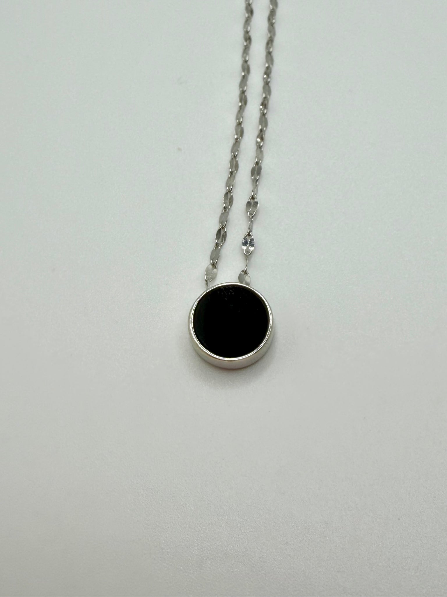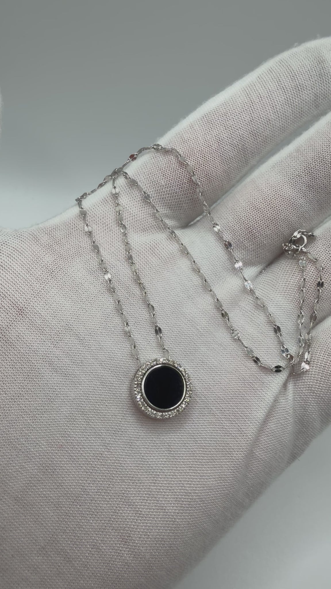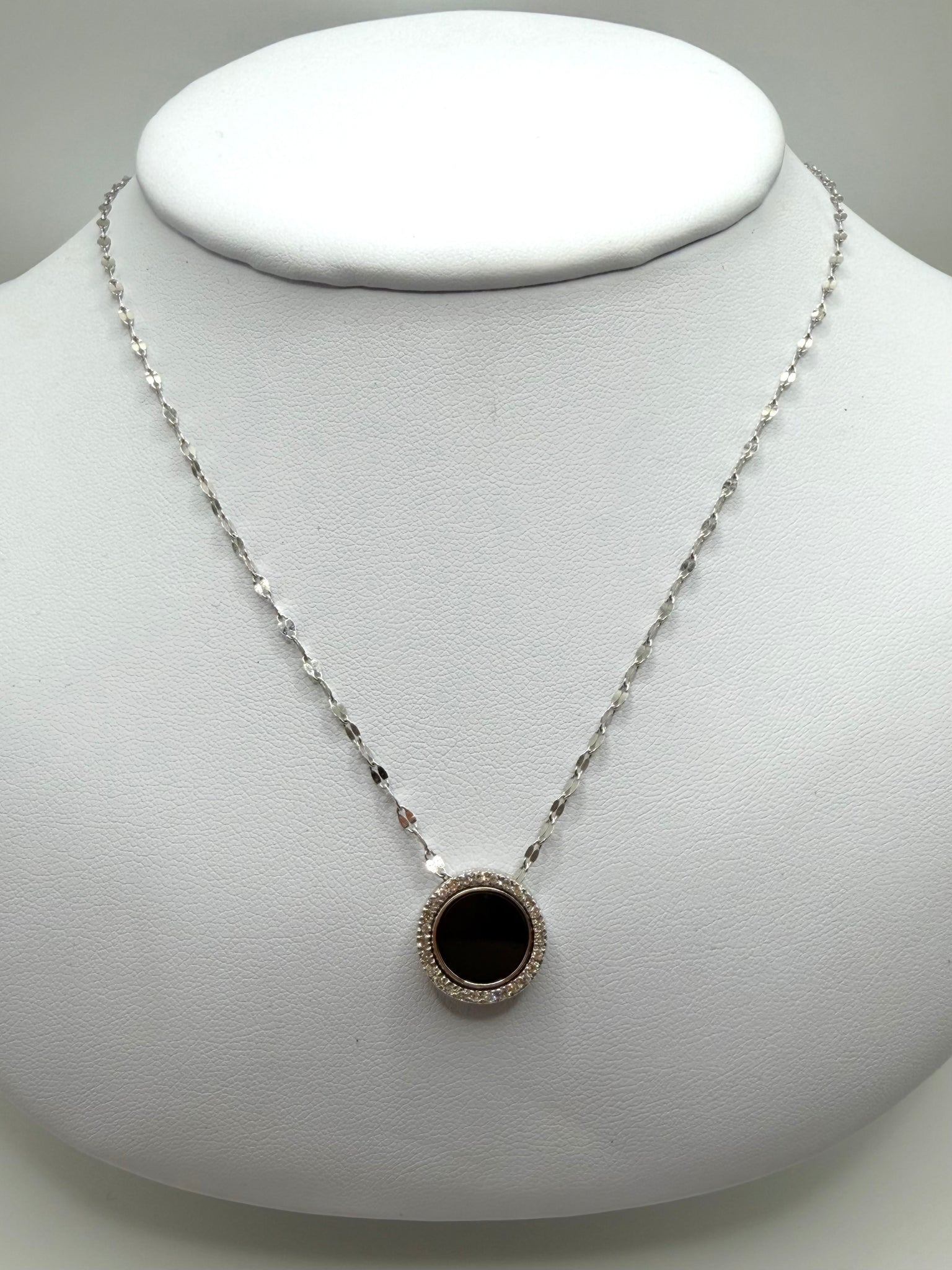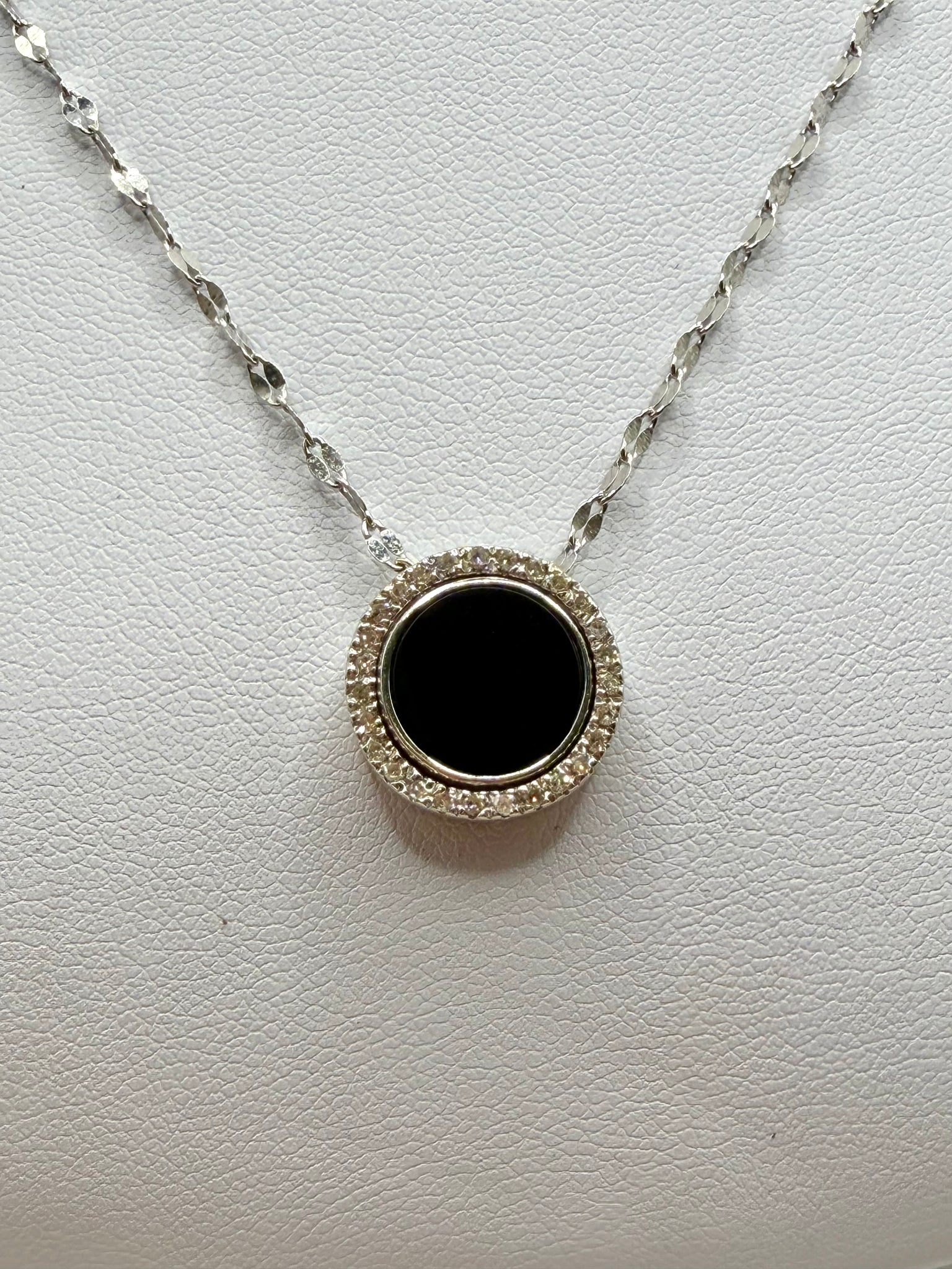 This necklace features a twisted mirror link chain crafted from 14K gold. This design reflects light effectively, enhancing visual appeal while maintaining a durable structure. The necklace's pendant is a diamond halo with a black onyx with a removable centre. Very classy and unique piece of solid gold jewelry.