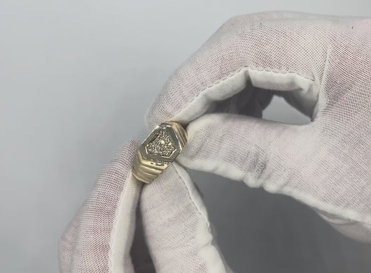 Expertly crafted with 10K gold and custom made, this heavy diamond ring exudes craftsmanship and detail. Adorned with diamonds, it adds a touch of luxury to any look. Made to last, it's a timeless piece that will elevate any outfit. Engraved “M.M”.