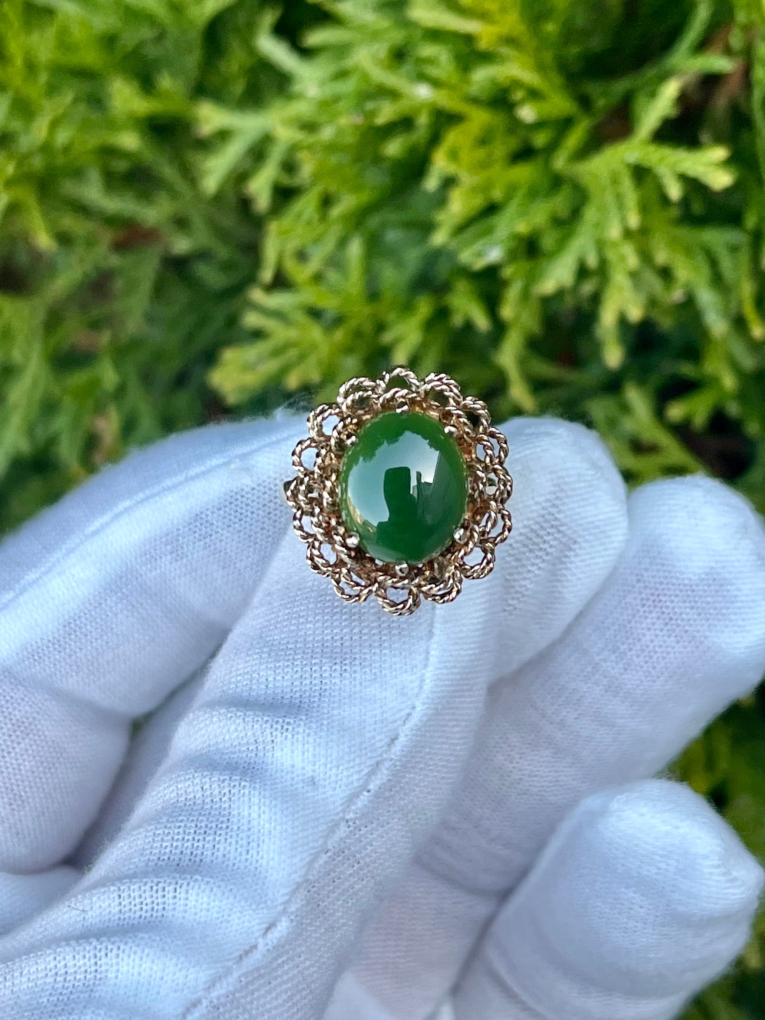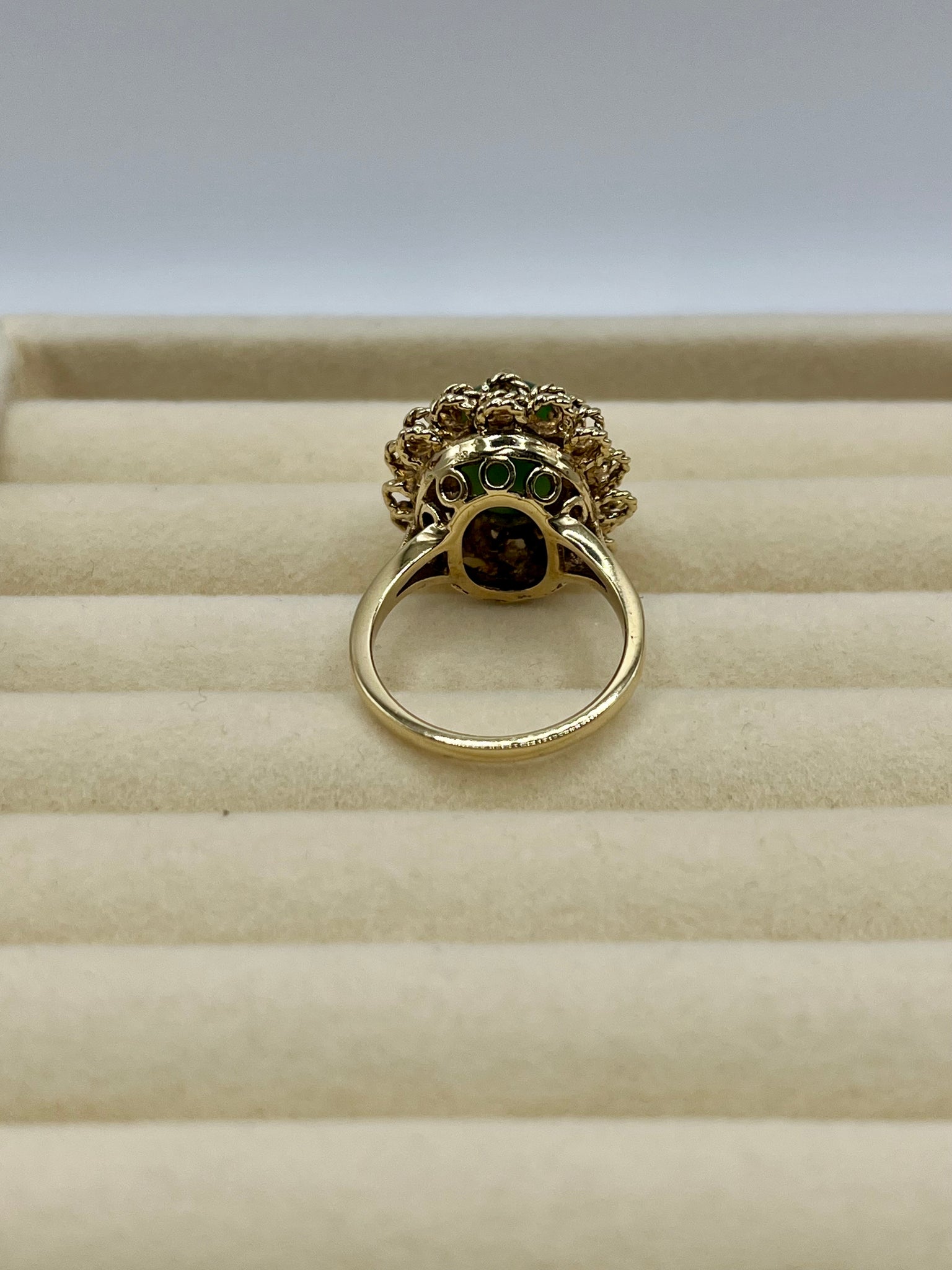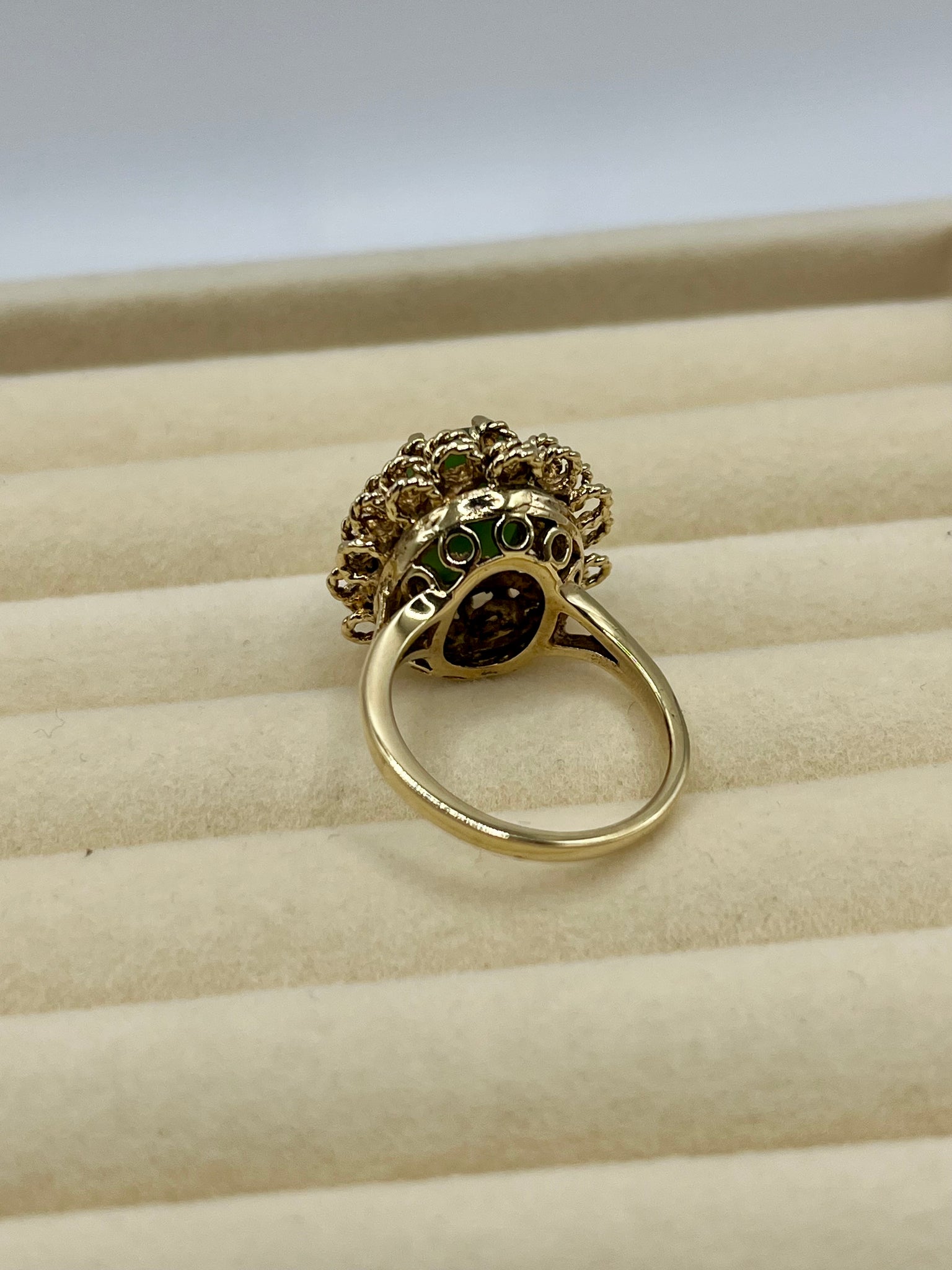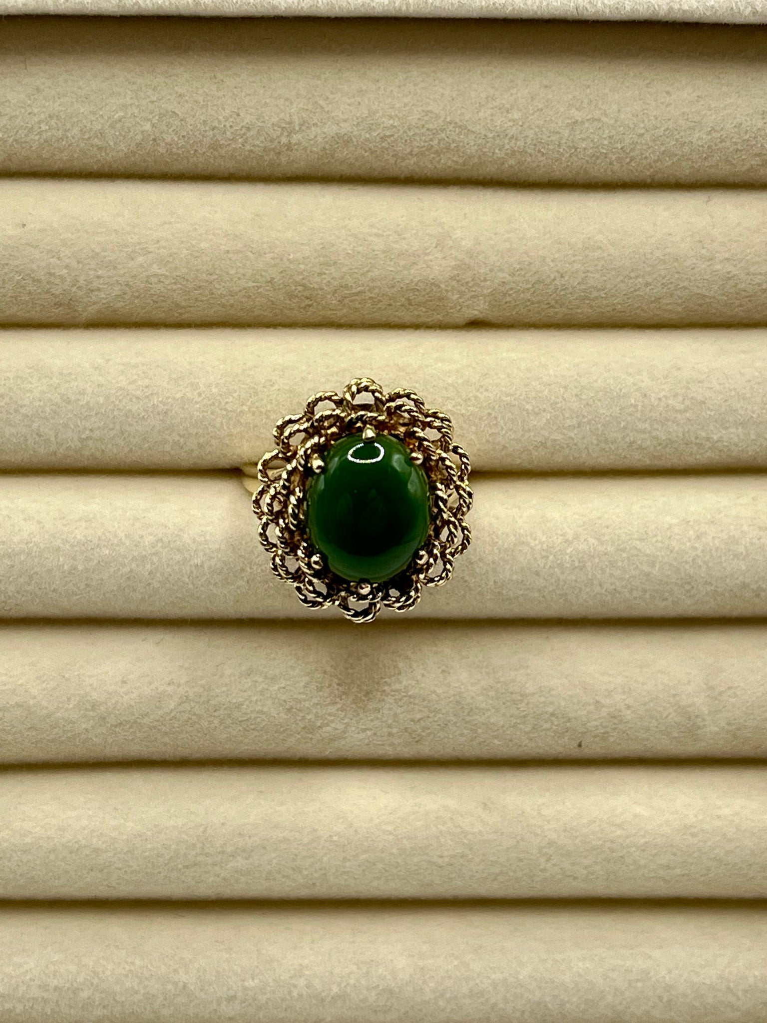 This 10K gold fancy Jade ring showcases a stunning design that is sure to catch the eye. Crafted with 10K gold and high-quality Jade, this ring exudes elegance and sophistication. Experience the beauty and luxury of this unique piece of jewelry.